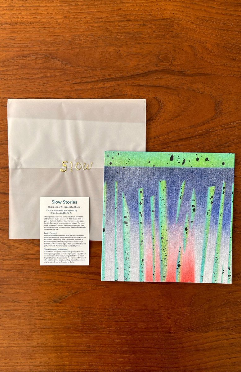 Combining narrative, music, and painting, Slow Stories is a collaboration between Bette Adriaanse and Brian Eno, based on Bette's short story collection of the same name. For the accompanying vinyl record, Eno's ambient compositions accompany her voice as she tells two stories from the book - The Endless House and The Other Village - while together the artists painted individual canvases bundled with each book and record.